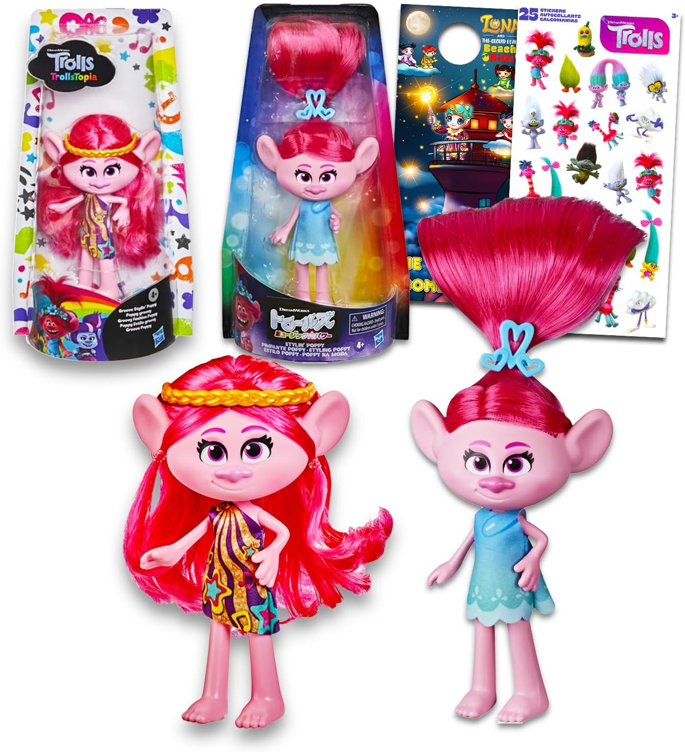 Classic Poppy Dolls – Featuring her signature pink hair, floral crown, and colorful dress.